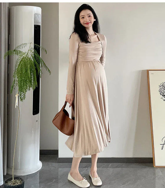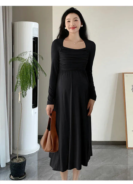 Designed for expectant mothers seeking both comfort and style, this two-piece maternity dress features a flattering square neckline and long sleeves for versatile layering. The thoughtfully constructed pieces adapt to your changing silhouette throughout pregnancy, offering support without restriction. The classic square collar adds a sophisticated touch, while the long sleeves provide coverage and warmth. Perfect for work, casual outings, or special occasions, this ensemble combines practical maternity design with timeless elegance. The two-piece configuration allows flexible styling options, letting you mix and match based on your preferences and needs.